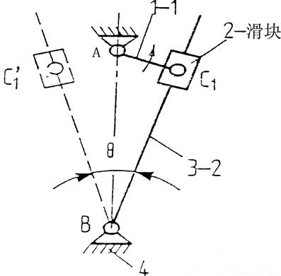機(jī)構(gòu)說明及工作特點(diǎn):如圖1所示的導(dǎo)桿機(jī)構(gòu),若使極位夾角θ>0,該導(dǎo)桿具有急回特性。該機(jī)構(gòu)常用于將等速轉(zhuǎn)動(dòng)轉(zhuǎn)換為具有急回特性的往復(fù)擺動(dòng)。